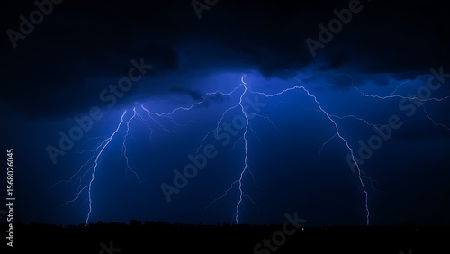 A dramatic lightning strike illuminates the dark stormy sky with electric blue brilliance.