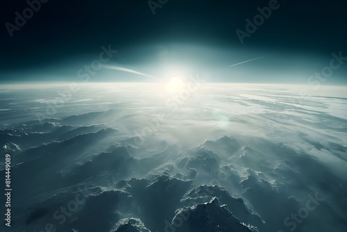 A dramatic outer space view of a planet, highlighting a sunlit ocean and swirling clouds, illustrating the planet's serene and majestic atmosphere