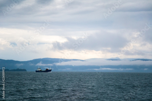 A dramatic, overcast scenery on the coeast of fjord during a ferry ride in Norway near Bergen. Moody autumn landscape of fjord.