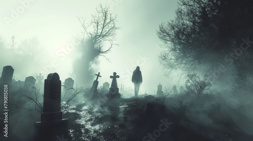 A dramatic papercut artwork depicting a lone figure walking through a foggy cemetery, with tombstones casting long shadows.