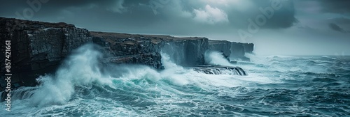 A dramatic photo of turbulent ocean waves crashing against jagged cliffs under an overcast sky