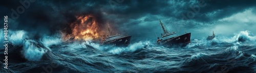A dramatic seascape featuring turbulent waters, stormy skies, and ships navigating through chaos amidst a fiery explosion.
