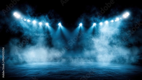 A dramatic stage scene with blue lights and mist, perfect for performances, events, or artistic presentations.