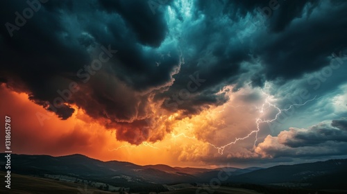 A dramatic storm forming in the distance over a mountain range, with clouds gathering and lightning flashing.