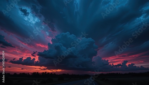 A dramatic sunset sky filled with towering cumulus clouds in deep blues, purples, and vibrant pinks.