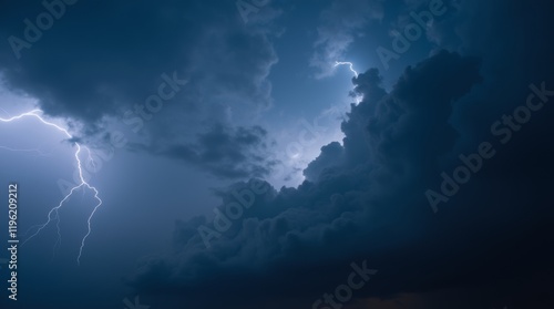 A dramatic thunderstorm sky filled with dark, swirling clouds and flashes of lightning, capturing the intensity and power of nature in a striking and atmospheric scene.