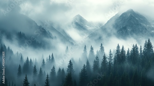 A dramatic view of mountains with a misty fog rolling in, capturing the mysterious and awe-inspiring aspect of nature with ample copy space.