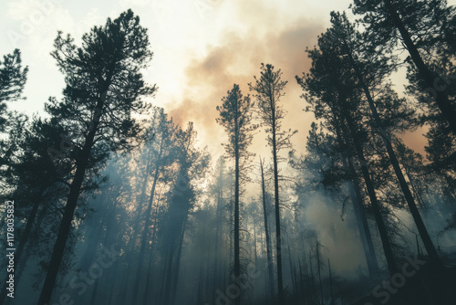 A dramatic view of tall trees surrounded by smoke in a forest, depicting the aftermath of a wildfire.