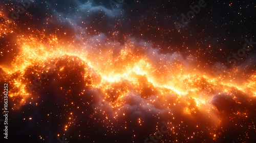 A dramatic,awe-inspiring depiction of a cosmic explosion,with fiery flames,radiant sparks,and a brilliant glow illuminating the darkened sky.
