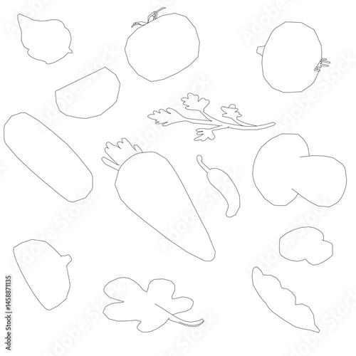 A drawing of various vegetables including carrots, tomatoes, and peppers. The vegetables are scattered throughout the image, with some overlapping and others placed in different positions
