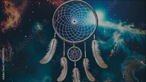 A dreamcatcher with white feathers set against the backdrop of space