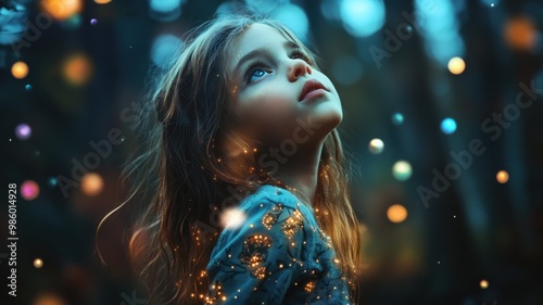 A dreamy child gazes upward, surrounded by ethereal lights, creating a whimsical atmosphere that evokes wonder and magic.