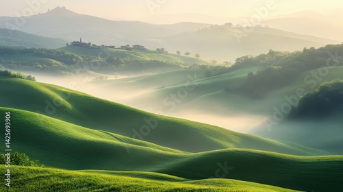A dreamy sunrise over rolling green hills, with mist rising from the valleys
