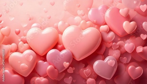 A dreamy Valentine's Day background with a cluster of glossy heart shaped balloons