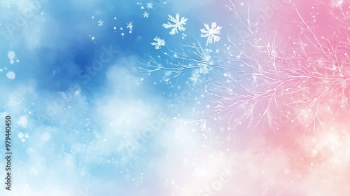 A dreamy winter background featuring delicate snowflakes and soft pastel colors in blue and pink hues, perfect for festive themes.