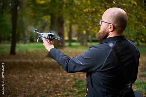 A drone enthusiast stands in a lush park surrounded by trees, ready to take flight as autumn leaves fall. The soft evening light enhances the moment.
