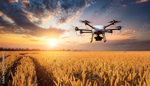 A drone hovers above a golden wheat field at sunset, showcasing agricultural technology and scenic beauty in a serene landscape.