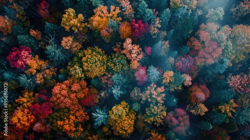 A drone shot of a vibrant autumn forest with colorful foliage
