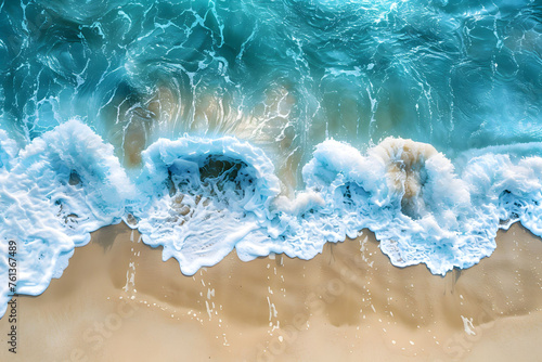 A drone shot of blue color sea waves hitting velvety soft sands , top view.
