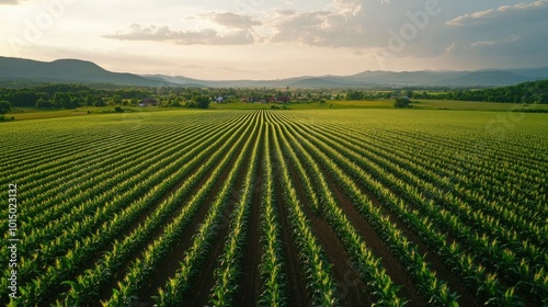 A drone shot of rows of corn plants in a vast field, with a small village visible in the distance.