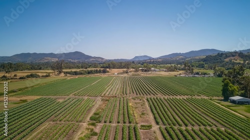 A drones aerial view of an expansive organic vegetable farm with neat rows stretching into the horizon.