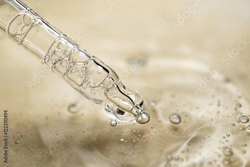 A drop of cosmetic aromatic oil drips from the pipette. Front view.