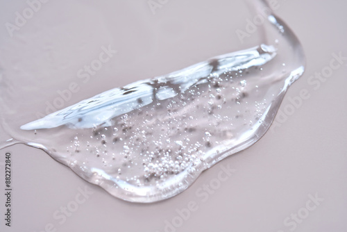 A drop of lubricant or cosmetic gel on a dusty pink background.