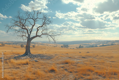 A dry, cracked desert landscape suffering from severe drought, withered tree, heatwaves