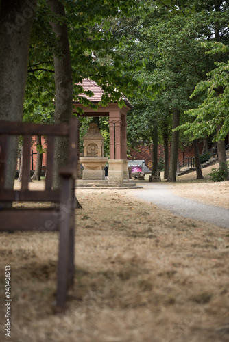A dry dying grass section in an urban park in england. Lack of rain causes grass to die. Water drought in europe. dusty and desolate.
