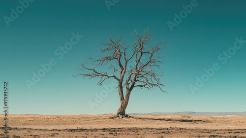 A dry, leafless tree standing tall in the desert, with a bright, cloudless sky overhead. -