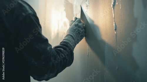 A drywall worker smoothing joint compound on a wall. Featuring attention to detail and technique