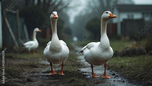 A duo of amusing white geese strolling through the muddy grassy area.