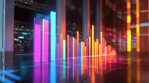 A dynamic 3D bar graph displayed on a digital screen, showcasing vibrant colors and varying heights, illustrating impressive business growth trends in a corporate environment.