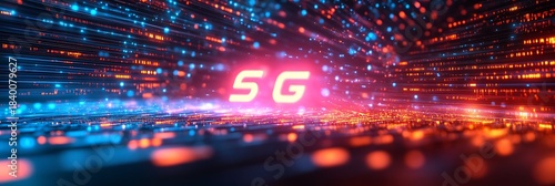 A dynamic 5G network design showcasing its speed and connectivity in the digital age. The image displays glowing blue and orange lights creating a futuristic atmosphere