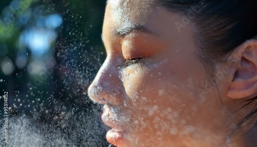 A dynamic action shot of a model spritzing facial mist onto their skin, capturing the refreshing sensation