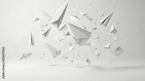 A dynamic arrangement of white paper airplanes and fragments, conveying a sense of motion and creativity against a minimalist backdrop.