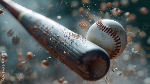 A dynamic close-up of a baseball and bat in motion, with particles flying off the bat, against a blurred background.