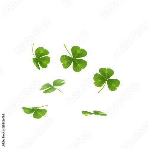A dynamic collection of fresh four-leaf clovers falling gently through the air captured in mid-motion with soft shadows