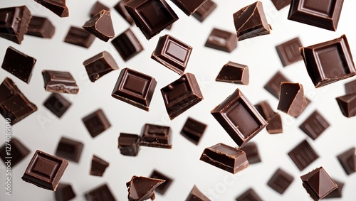 A dynamic composition of dark chocolate pieces floating against a clean white background, capturing the essence of indulgence
