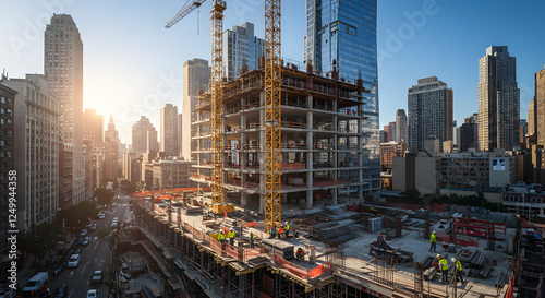 A dynamic construction site for a new skyscraper rising in a vibrant urban cityscape