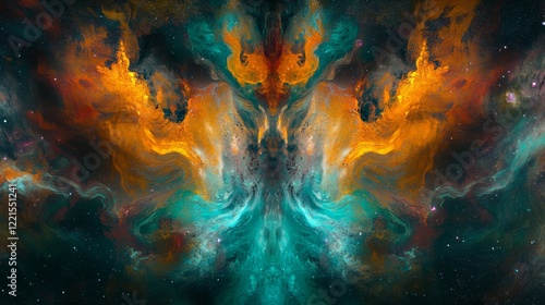 A dynamic cosmic landscape, with vibrant colors and flowing forms, presents an abstract portrayal of celestial energy and creation in the universe's vastness.