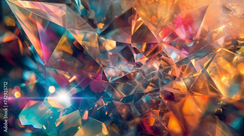 A dynamic digital art background featuring the explosive dispersion of light through a crystal prism, resulting in a kaleidoscope of geometric shapes