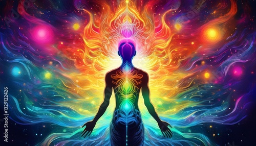 A dynamic explosion of chakra colors, as if the universe is channeling divine energy, radiating power, balance, and cosmic flow