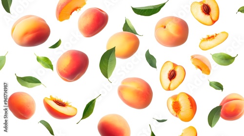 A dynamic flat lay composition of falling peaches and leaves. Making it perfect for promoting healthy eating, organic farming, or summer-themed advertising campaigns