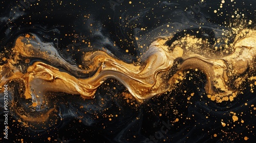 A dynamic gold abstract design on black marble, featuring fluid watercolor patterns, white ink splatters, and contemporary brush strokes, creating an elegant and high-end background