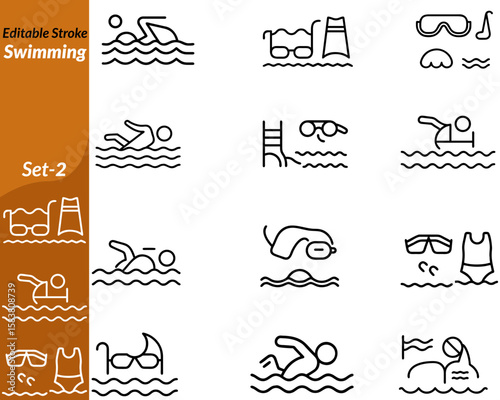 A dynamic icon of a swimmer gliding through water with motion lines, symbolizing aquatic sports, fitness, competition, summer fun, healthy lifestyle, water safety, and physical endurance.