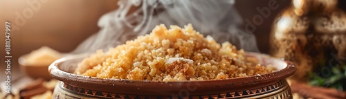 A dynamic image of a Moroccan seffa, with its sweet, fluffy couscous and cinnamonsugar topping, set against a traditional Moroccan backdrop with warm lighting