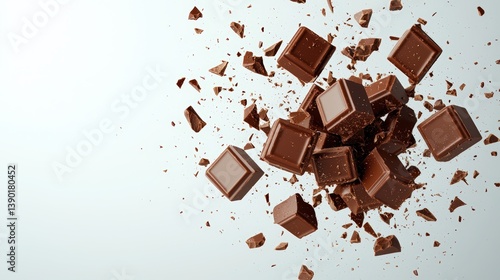 A dynamic image of chocolate pieces exploding, showcasing rich textures and varying shades of brown against a light background.