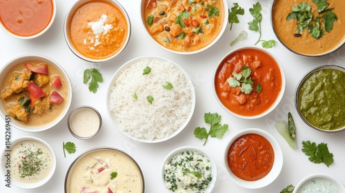 A dynamic overhead shot of various Thai curry dishes, including curry rice, surrounded by colorful side dishes and dipping sauces, capturing the essence of a Thai feast.