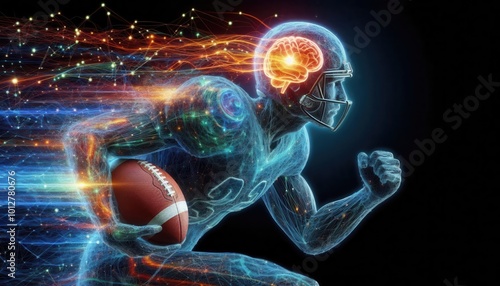 A dynamic representation of a football player in motion, blending athleticism with technology. Perfect for sports, health, and innovation themes.